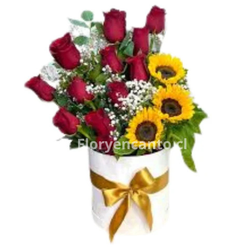 El Box de 12 Rosas Rojas y 3 Girasoles es una presentación elegante y vibrante, perfecta para sorprender a una persona especial. Este arreglo floral contiene 12 hermosas rosas rojas, que simbolizan el amor y la pasión, acompañadas por 3 girasoles radiantes que aportan energía, luz y frescura. El conjunto está cuidadosamente dispuesto en una caja decorativa que resalta la belleza de las flores y le da un toque único al regalo. Entrega a domicilio en Santiago de Chile.