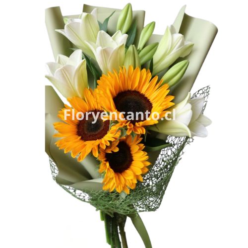 Un hermoso ramo que combina la calidez de tres girasoles con la elegancia y serenidad de tres liliums blancos. Los girasoles simbolizan la alegría, vitalidad y energía del sol, mientras que los liliums representan la pureza, paz y armonía.